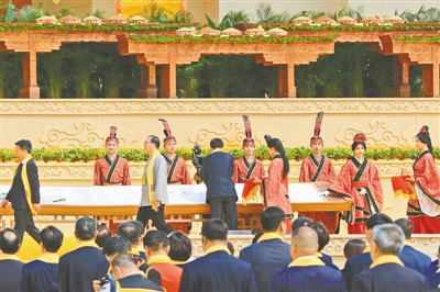 祈福中華。拜祖臺(tái)上,一幅波濤壯闊的黃河畫卷徐徐展開(kāi)。古小玉、何新、劉家強(qiáng)、符之冠、陸進(jìn)、徐顯明、孫達(dá),中央統(tǒng)戰(zhàn)部九局二級(jí)巡視員孫彥濤,國(guó)家文化和旅游部一級(jí)巡視員王鶴云,中國(guó)工程院院士、全國(guó)勘察設(shè)計(jì)大師何鏡堂,中國(guó)工程院院士、第二屆國(guó)醫(yī)大師王琦,中國(guó)工程院院士、華東合成生物產(chǎn)業(yè)技術(shù)研究院負(fù)責(zé)人鄭裕國(guó),全國(guó)政協(xié)委員、北京大學(xué)教授張頤武,中國(guó)文聯(lián)書記處原書記、中國(guó)電影家協(xié)會(huì)分黨組原書記張宏,中國(guó)美術(shù)家協(xié)會(huì)分黨組書記、中國(guó)美術(shù)家協(xié)會(huì)副主席馬鋒輝,中國(guó)戲劇家協(xié)會(huì)分黨組書記、駐會(huì)副主席陳涌泉,中國(guó)食品藥品企業(yè)質(zhì)量安全促進(jìn)會(huì)會(huì)長(zhǎng)毛振賓,國(guó)學(xué)專家、講席教授、北京中醫(yī)藥大學(xué)國(guó)學(xué)院創(chuàng)院院長(zhǎng)張其成,知名學(xué)者、浙江大學(xué)求是特聘教授鄭強(qiáng),資深媒體專家胡錫進(jìn),中歐經(jīng)濟(jì)文化研究發(fā)展中心會(huì)長(zhǎng)柯海嘯,中國(guó)男高音歌唱家、河南音樂(lè)學(xué)院院長(zhǎng)戴玉強(qiáng),河南鄧亞萍體育產(chǎn)業(yè)投資基金董事長(zhǎng)鄧亞萍,全國(guó)政協(xié)委員、知名作家蔣勝男,首屆岐黃學(xué)者、河南中醫(yī)藥大學(xué)校長(zhǎng)王耀獻(xiàn),全國(guó)人大代表、依文集團(tuán)董事長(zhǎng)夏華,同仁堂集團(tuán)董事長(zhǎng)王貴平,香港中資基金業(yè)協(xié)會(huì)會(huì)長(zhǎng)連少冬,中鐵工程裝備集團(tuán)有限公司董事長(zhǎng)趙華,國(guó)家級(jí)非物質(zhì)文化遺產(chǎn)石雕項(xiàng)目代表性傳承人劉紅立,在畫卷上蓋印,以黃河為證,祝福國(guó)家安泰、海宇寧謐。