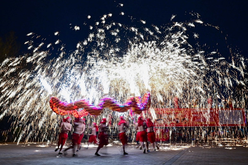 民間藝人在河南省洛陽市2024隋唐河洛文化廟會(huì)上表演打鐵花(2024年2月14日攝)。新華社發(fā)(李衛(wèi)超 攝)