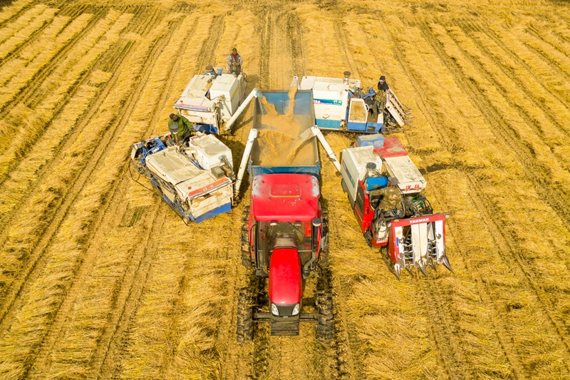 在黑龍江省綏化市北林區(qū)雙河鎮(zhèn),村民駕駛收割機(jī)進(jìn)行卸糧作業(yè)(2024年10月13日攝,無人機(jī)照片)。新華社記者 張濤 攝